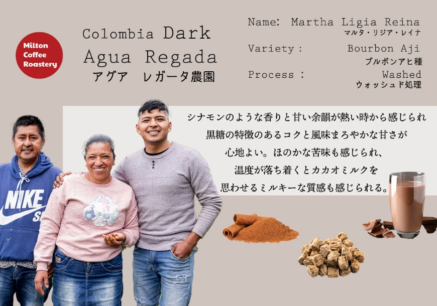 マルタ・リジア・レイナさんは、コロンビア南部ウイラ県ピタリトのブルセラス地区にある「アグアレガーダ農園」を営む女性生産者です。2010年、故郷を離れ新天地で一からコーヒーづくりを学び始め、少しずつ乾燥設備などを整えながら品質を高めてきました。